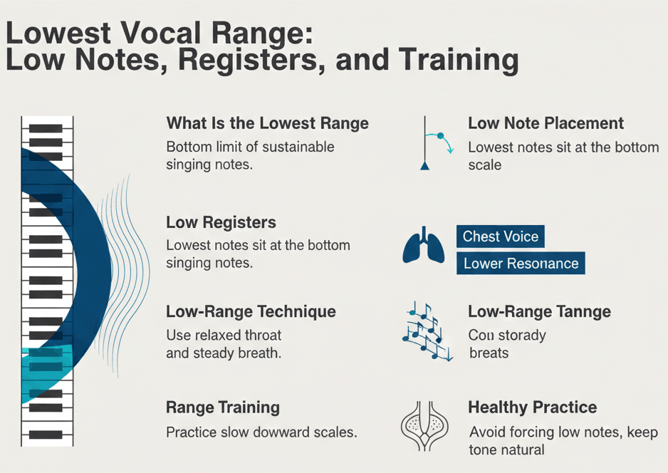 This guide presents the lowest human vocal ranges, the deepest notes ever recorded, and the vocal mechanisms that make such frequencies possible. It also includes practical insights for singers interested in expanding their own lower range, supported by internal references to range-testing tools, vocal science resources, and bass-range studies.