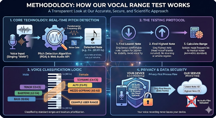 We know that singers want tools they can trust—not just for accuracy, but also for privacy, transparency, and real-world reliability. That’s why our vocal range test follows a proven, evidence-based approach: