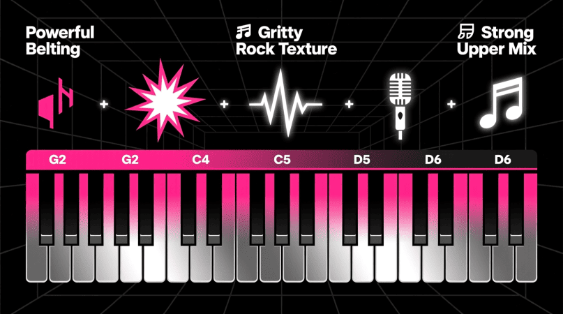 She is classified as a mezzo-soprano with a rock-pop hybrid tone that gives her a muscular, edgy sound few singers can replicate.