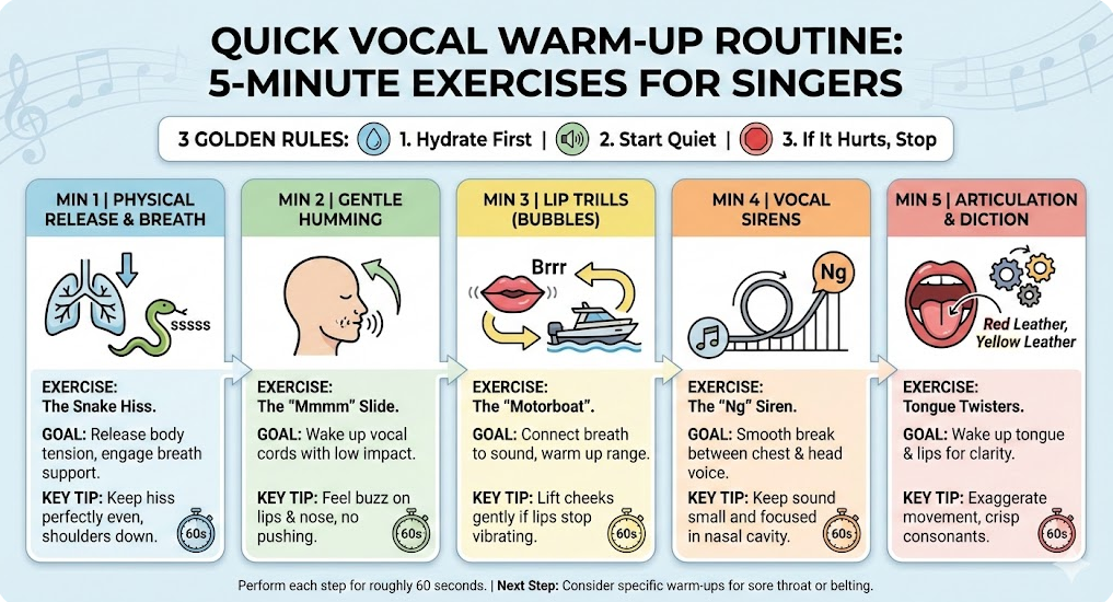 Some days you don’t have time for a long practice session, but you still want your voice to feel ready before singing. That’s where a quick vocal warm-up routine comes in. Even 5 minutes of smart, focused exercises can prepare your voice for singing safely and help you avoid strain.