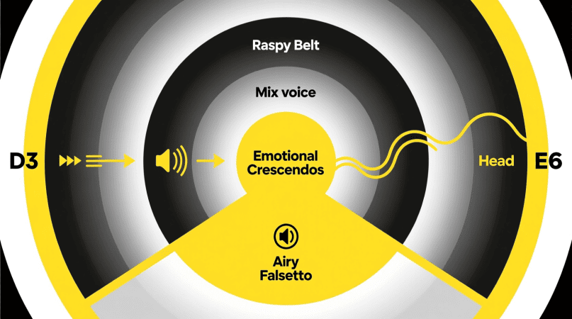 Middle RegisterA3 – C5Raspy, emotional, textured“Elastic Heart,” “Alive”